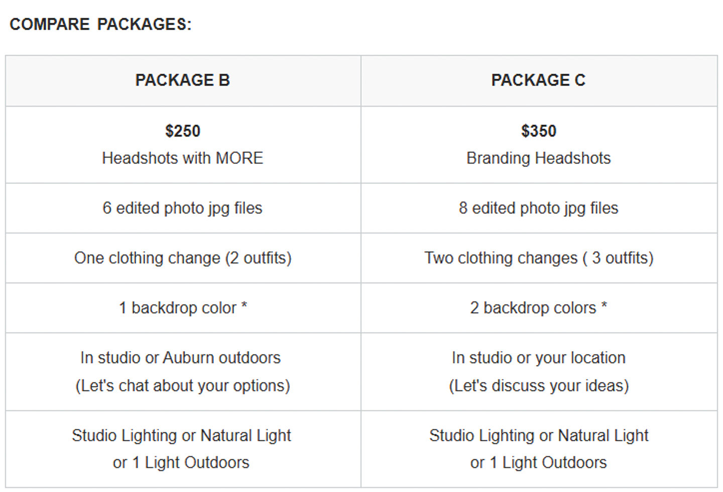 Pkg C: A bigger package - more time and more photos. This slightly longer session time allows for more creative input and solutions. It can be whatever you'd like it to be. Let's talk about your ideas or brainstorm together.